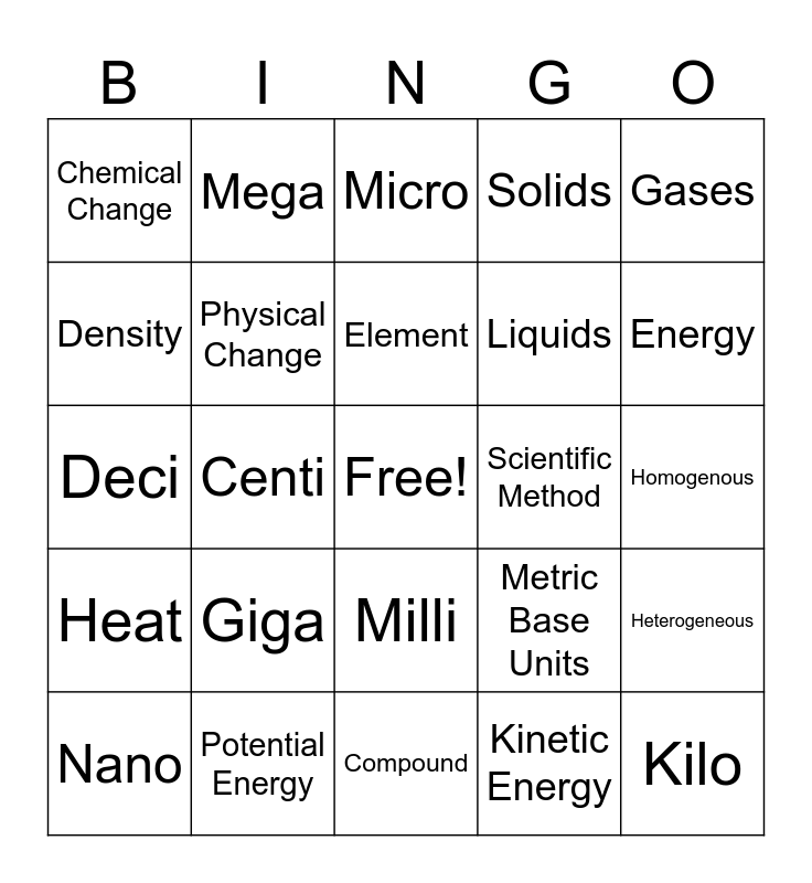 This bingo card has a free space and 24 words: Giga, Potential Energy, Element, Nano, Gases, Chemical Change, Density, Mega, Scientific Method, Milli, Liquids, Deci, Metric Base Units, Heterogeneous, Physical Change, Kinetic Energy, Homogenous, Micro, Energy, Centi, Kilo, Heat, Solids and Compound.