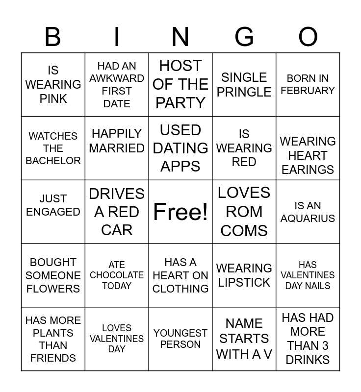 This bingo card has a free space and 24 words: ATE CHOCOLATE TODAY, LOVES VALENTINES DAY, USED DATING APPS, HAS MORE PLANTS THAN FRIENDS, BORN IN FEBRUARY, IS WEARING PINK, WATCHES THE BACHELOR, HAD AN AWKWARD FIRST DATE, LOVES ROM COMS, HAS A HEART ON CLOTHING, IS WEARING RED, JUST ENGAGED, WEARING LIPSTICK, HAS VALENTINES DAY NAILS, HAPPILY MARRIED, NAME STARTS WITH A V, IS AN AQUARIUS, HOST OF THE PARTY, WEARING HEART EARINGS, DRIVES A RED CAR, HAS HAD MORE THAN 3 DRINKS, BOUGHT SOMEONE FLOWERS, SINGLE PRINGLE and YOUNGEST PERSON.