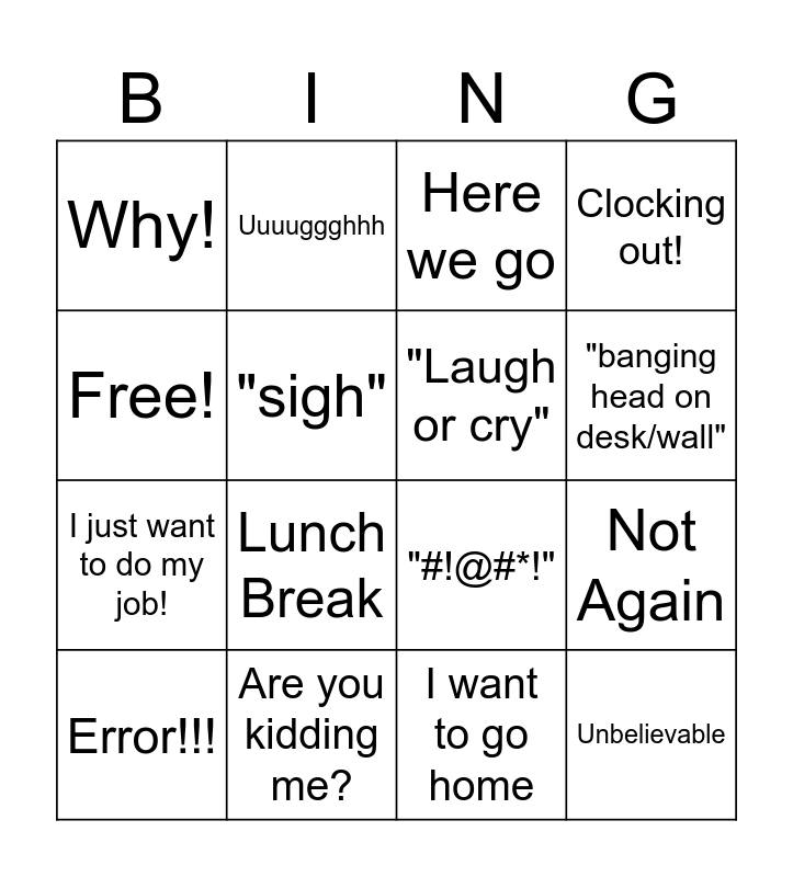 This bingo card has 16 words: Are you kidding me?, Not Again, Here we go, Why!, I just want to do my job!, Uuuuggghhh, "#!@#*!", I want to go home, Free!, "sigh", Error!!!, Clocking out!, Lunch Break, "banging head on desk/wall", "Laugh or cry" and Unbelievable.