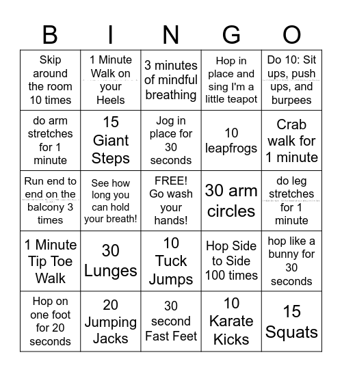 This bingo card has 4 images, a free space and 24 words: 30 Lunges, 20 Jumping Jacks, Jog in place for 30 seconds, Hop on one foot for 20 seconds, Do 10: Sit ups, push ups, and burpees, Skip around the room 10 times, do arm stretches for 1 minute, 1 Minute Walk on your Heels, 30 arm circles, 10 Tuck Jumps, 10 leapfrogs, Run end to end on the balcony 3 times, Hop Side to Side 100 times, hop like a bunny for 30 seconds, 15 Giant Steps, 10 Karate Kicks, do leg stretches for 1 minute, 3 minutes of mindful breathing, Crab walk for 1 minute, See how long you can hold your breath!, 15 Squats, 1 Minute Tip Toe Walk, Hop in place and sing I'm a little teapot and 30 second Fast Feet.