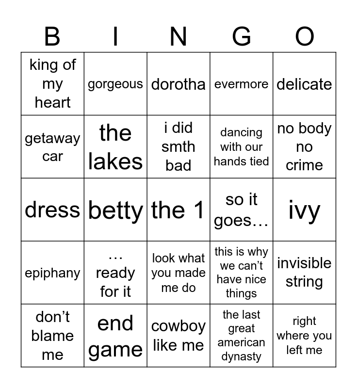 This bingo card has a free space and 24 words: …ready for it, end game, i did smth bad, don’t blame me, delicate, king of my heart, getaway car, gorgeous, so it goes…, look what you made me do, dancing with our hands tied, dress, this is why we can’t have nice things, invisible string, the lakes, the last great american dynasty, ivy, dorotha, no body no crime, betty, right where you left me, epiphany, evermore and cowboy like me.