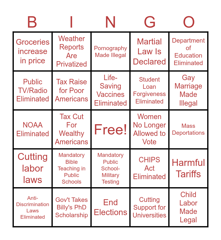 This bingo card has a free space and 24 words: Mandatory Bible Teaching in Public Schools, Gov't Takes Billy's PhD Scholarship, Life-Saving Vaccines Eliminated, Anti-Discrimination Laws Eliminated, Department of Education Eliminated, Groceries increase in price, Public TV/Radio Eliminated, Weather Reports Are Privatized, Women No Longer Allowed to Vote, Mandatory Public School-Military Testing, Student Loan Forgiveness Eliminated, NOAA Eliminated, CHIPS Act Eliminated, Harmful Tariffs, Tax Raise for Poor Americans, Cutting Support for Universities, Mass Deportations, Pornography Made Illegal, Gay Marriage Made Illegal, Tax Cut For Wealthy Americans, Child Labor Made Legal, Cutting labor laws, Martial Law Is Declared and End Elections.