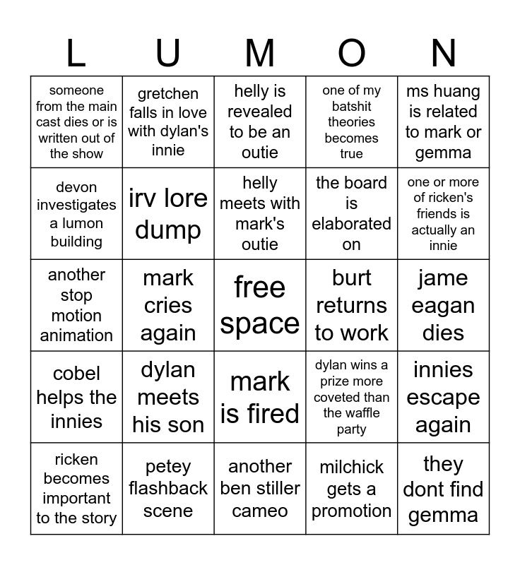 This bingo card has a free space and 24 words: dylan meets his son, petey flashback scene, helly meets with mark's outie, ricken becomes important to the story, ms huang is related to mark or gemma, someone from the main cast dies or is written out of the show, devon investigates a lumon building, gretchen falls in love with dylan's innie, burt returns to work, mark is fired, the board is elaborated on, another stop motion animation, dylan wins a prize more coveted than the waffle party, innies escape again, irv lore dump, milchick gets a promotion, jame eagan dies, helly is revealed to be an outie, one or more of ricken's friends is actually an innie, mark cries again, they dont find gemma, cobel helps the innies, one of my batshit theories becomes true and another ben stiller cameo.