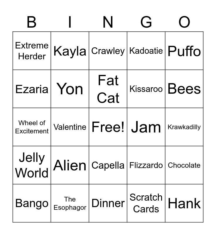 This bingo card has a free space and 125 words: Basic, Battledome, Avatar, Faerieland, Meridell, Roo Island, Jelly World, The Giant Omelette, Scratch Cards, Snowager, Tombola, Jhudora, Illusen, Fyora, Isca, Quests, The Esophagor, The Brain Tree, Edna, Petpet, Petpetpet, Wheel of Excitement, Wheel of Misfortune, Wheel of Mediocrity, Zap, Fat Cat, Kadoatie, Maraquan, Plushie, Robot, Chocolate, Birthday, Valentine, Alien, Baby, Relics, Sutek's Tomb, Carnival of Terror, Ice Cream Machine, Faerie Bubbles, Extreme Herder, The Three, Nerkmid, Neocola Token, Restocking, Food Club, Gooblah, Puffo, High Score Table, Dubloon, Codestone, Merry Go Round, Gardening, Meker, Britt, Bry, Abigail, Lucas, Alex, Jam, Ezaria, Meadow, Nichole, Kat, Pilk, Sharkira, Olympe, Capella, Lunella, Krawkadilly, ManBearPig, Deprivation, Chewcudda, Hollar, Trixi, Nomnomnom, Nicco, Jac, Grenadine, Angel, Mature, Insomnia, Bingo, Bango, Yon, Samurai Pizza Cats, Megan, Nym, Rel, Bryan, Advert Attack, Dubloon Disaster, Better Than You, World Challenge, Crawley, Dinner, Jenn, Super Attack Pea, Verizon, Hank, Misty, Flizzardo, Fish Negg, Evil Fuzzle, Weewoo, Jessica, Chickens, Bees, Potatoes, Fungus, Toebeans, Beans, Dingleberry, Peepi, Pustulio, Patapsco, Bob Ross, Bubblina, Mechagodzilla, Kissaroo, Sneky, Rey, Prog, Kayla and Ixi.