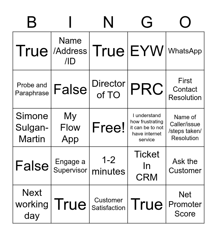 This bingo card has a free space and 31 words: Customer Satisfaction, Repeat Calls, My Flow App, EYW, True, True, False, Ticket In CRM, I understand how frustrating it can be to not have internet service, True, Name of Caller/issue /steps taken/ Resolution, Net Promoter Score, Beginning of a call, True, First Contact Resolution, Every 7 DAYS, Ask the Customer, Engage a Supervisor, False, 1-2 minutes, WhatsApp, #Accelerate Action, Next working day, Name /Address /ID, PRC, Probe and Paraphrase, EYW, Simone Sulgan-Martin, True, Director of TO and False.