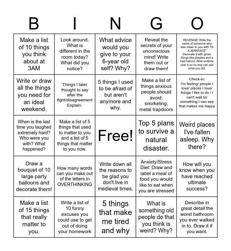 This bingo card has a free space and 39 words: Introduce yourself by telling about your relationship status, stress, how you sleep, friends, how you relax, and favorite things., Make a list of your top 10 irrational fears: examples-being eaten by wolves, ax murderers, choking on cotton candy, etc., Make a RAGE PAGE and fill it with all the things that make you angry. Add some angry colors!, Things I later thought to say after the fight/disagreement Explain., Make a list of 15 things that really matter to you., Write down all the reasons to be glad you don't live in medieval times., 5 things I used to be afraid of but aren't anymore and why., Draw and color a picture of yourself with the worst haircut / style, REVENGE! Write the name of someone who was mean to you with "IS A JERKFACE" Decorate it with gross things like pimples and a bad haircut. Now scribble over it so no one can see what you did., Draw a bouquet of 10 large party balloons and decorate them!, Make a list of 5 things that used to matter to you and a list of 5 things that matter to you now., Reveal the secrets of your unconscious mind! Write them out or draw them!, Describe in great detail the worst bathroom you ever walked in to. Draw it if you want., Weird places I've fallen asleep. Why there?, Top 5 plans to survive a natural disaster., How many words can you make out of the letters in OVERTHINKING, What does your future look like? write or draw about it!, Make a list of 10 things you think about at 3AM, What I do to calm down when I am freaking out and why it works, Anxiety/Stress Diet: Draw and label a meal of food you would like to eat when you are stressed, Write or draw all the things you need for an ideal weekend., 5 things that make me tired and why, Make a list of things anxious people should avoid: snorkeling, metal trapdoors, Check-in: I'm feeling/ people I love/ places I love/ things I like to do / I can't wait to/ something I can see that makes me happy, Bad habits I probably need to get rid of..., How would you spend $100,000 if it magically appeared in your room?, What things are currently keeping you awake at night causing you stress?, If you didn't have to worry about money or other people's opinions, what would you do with your life?, What's the best outfit you've ever owned and why do you love it?, Look around. What is different in the room today? What did you notice?, What do you need MORE of in your life right now?, If you could have a completely useless superpower, what would it be? Why?, What advice would you give to your 6-year old self? Why?, Write a list of 10 funny excuses you could use to get out of doing your homework, What is something old people do that you think is weird? Why?, Who are the 5 people you spend the most time with? How do they impact your life and behavior?, How will you know when you have reached ultimate success?, When is the last time you laughed extremely hard? Who were you with? What happened? and What is the most interesting tea you've ever experienced?.