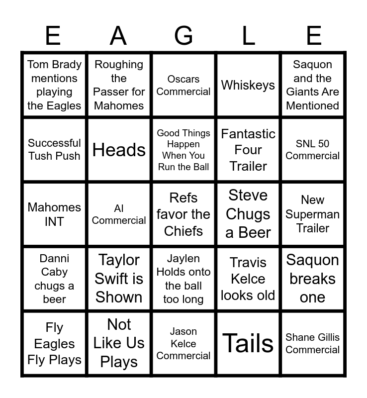 This bingo card has a free space and 24 words: Taylor Swift is Shown, Not Like Us Plays, Good Things Happen When You Run the Ball, Fly Eagles Fly Plays, Saquon and the Giants Are Mentioned, Tom Brady mentions playing the Eagles, Successful Tush Push, Roughing the Passer for Mahomes, Steve Chugs a Beer, Jaylen Holds onto the ball too long, Fantastic Four Trailer, Mahomes INT, Travis Kelce looks old, Saquon breaks one, Heads, Tails, New Superman Trailer, Oscars Commercial, SNL 50 Commercial, AI Commercial, Shane Gillis Commercial, Danni Caby chugs a beer, Whiskeys and Jason Kelce Commercial.