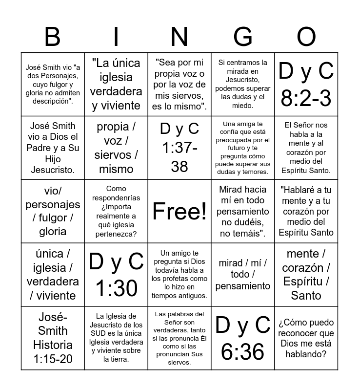 This bingo card has a free space and 24 words: José-Smith Historia 1:15-20, D y C 1:30, D y C 1:37-38, D y C 6:36, D y C 8:2-3, José Smith vio "a dos Personajes, cuyo fulgor y gloria no admiten descripción"., "La única iglesia verdadera y viviente, "Sea por mi propia voz o por la voz de mis siervos, es lo mismo"., Mirad hacia mí en todo pensamiento no dudéis, no temáis"., "Hablaré a tu mente y a tu corazón por medio del Espíritu Santo, vio/ personajes / fulgor / gloria, propia / voz / siervos / mismo, mirad / mí / todo / pensamiento, mente / corazón / Espíritu / Santo, José Smith vio a Dios el Padre y a Su Hijo Jesucristo., La Iglesia de Jesucristo de los SUD es la única Iglesia verdadera y viviente sobre la tierra., Las palabras del Señor son verdaderas, tanto si las pronuncia Él como si las pronuncian Sus siervos., Si centramos la mirada en Jesucristo, podemos superar las dudas y el miedo., El Señor nos habla a la mente y al corazón por medio del Espíritu Santo., única / iglesia / verdadera / viviente, Como respondenrías ¿Importa realmente a qué iglesia pertenezca?, Un amigo te pregunta si Dios todavía habla a los profetas como lo hizo en tiempos antiguos., Una amiga te confía que está preocupada por el futuro y te pregunta cómo puede superar sus dudas y temores. and ¿Cómo puedo reconocer que Dios me está hablando?.