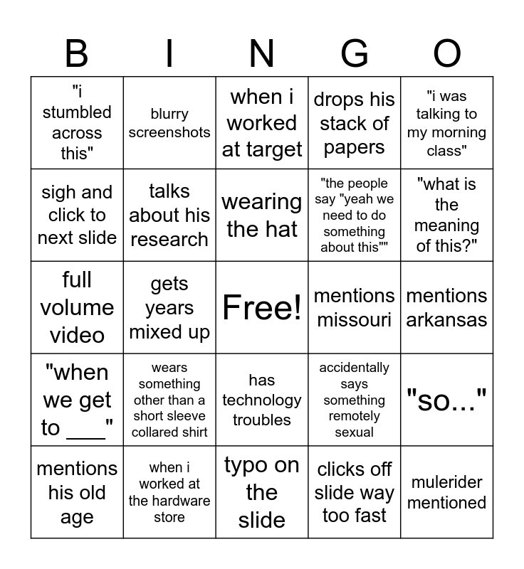 This bingo card has a free space and 39 words: wears plaid, drinks from white waterbottle, ends class early, talks about his research, mentions his old age, has technology troubles, wearing the hat, references "i was shot", "i was talking to my morning class", "when we get to ___", gets years mixed up, drops his stack of papers, mulerider mentioned, mentions arkansas, mentions missouri, wears something other than a short sleeve collared shirt, questionable use of slang, "i stumbled across this", wears a color other than neutral, accidentally says something remotely sexual, sigh and click to next slide, typo on the slide, "the people say "yeah we need to do something about this"", "what is the meaning of this?", email notification full volume, starts class on time, screenshots from twitter, "before technology was advanced", tells a personal story, blurry screenshots, iowa mentioned, german mentioned, when i worked at target, when i worked at the hardware store, clicks off slide way too fast, "if this class was smaller we'd do ___", "so...", full volume video and reference to pop culture.