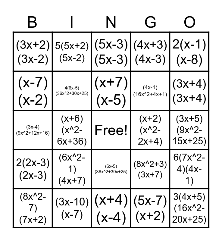 This bingo card has a free space and 24 words: (8x^2-7)(7x+2), (6x^2-1)(4x+7), (x+7)(x-5), (5x-7)(x+2), 2(x-1)(x-8), (3x+2)(3x-2), 5(5x+2)(5x-2), (5x-3)(5x-3), (x+2)(x^2-2x+4), (3x+5)(9x^2-15x+25), (3x-4)(9x^2+12x+16), 4(6x-5)(36x^2+30x+25), (8x^2+3)(3x+7), 6(7x^2-4)(4x-1), (x-7)(x-2), (3x-10)(x-7), (x+4)(x-4), (4x+3)(4x-3), (3x+4)(3x+4), 2(2x-3)(2x-3), (x+6)(x^2-6x+36), (6x-5)(36x^2+30x+25), (4x-1)(16x^2+4x+1) and 3(4x+5)(16x^2-20x+25).
