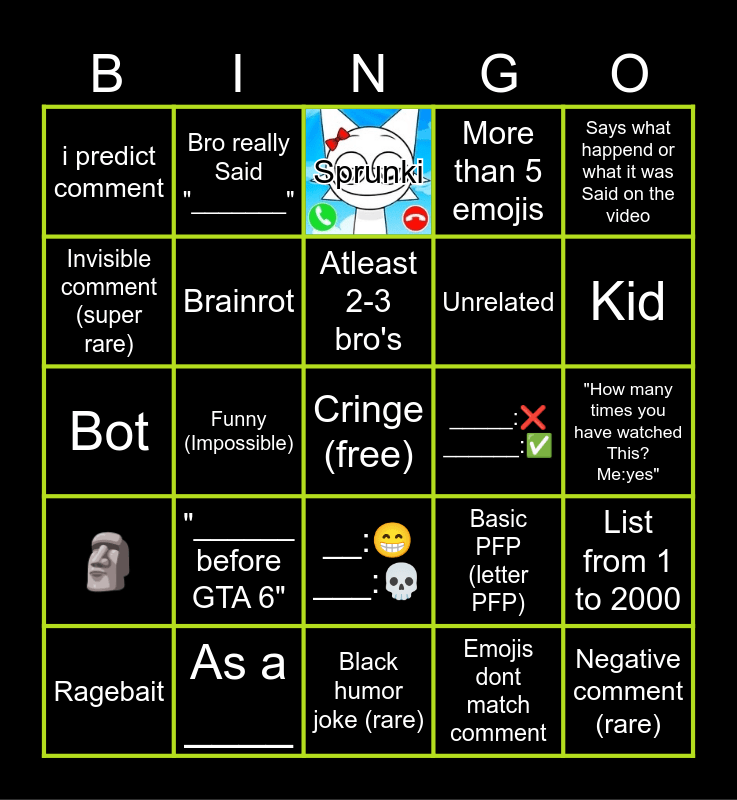 This bingo card has 1 images, a free space and 24 words: "______ before GTA 6", As a ____, Atleast 2-3 bro's, Ragebait, Says what happend or what it was Said on the video, i predict comment, Invisible comment (super rare), Bro really Said "_______", _____:❌ ______:✅, __:😁 ___:💀, Unrelated, Bot, Basic PFP (letter PFP), List from 1 to 2000, Brainrot, Emojis dont match comment, "How many times you have watched This? Me:yes", Sprunki, Kid, Funny (Impossible), Negative comment (rare), 🗿, More than 5 emojis and Black humor joke (rare).