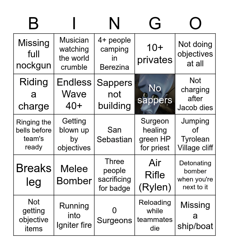 This bingo card has 1 images, a free space and 24 words: Melee Bomber, Running into Igniter fire, Sappers not building, Not getting objective items, Not doing objectives at all, Missing full nockgun, Riding a charge, Musician watching the world crumble, Surgeon healing green HP for priest, Three people sacrificing for badge, No sappers, Ringing the bells before team's ready, Air Rifle (Rylen), Detonating bomber when you're next to it, Endless Wave 40+, Reloading while teammates die, Jumping of Tyrolean Village cliff, 4+ people camping in Berezina, Not charging after Jacob dies, Getting blown up by objectives, Missing a ship/boat, Breaks leg, 10+ privates and 0 Surgeons.