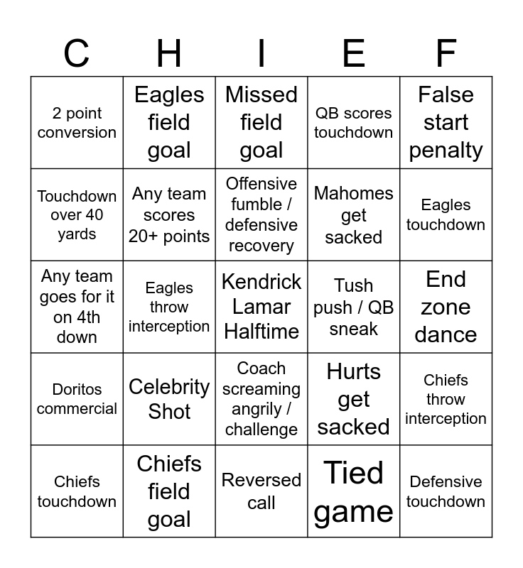 This bingo card has a free space and 24 words: Celebrity Shot, Chiefs field goal, Offensive fumble / defensive recovery, Chiefs touchdown, False start penalty, 2 point conversion, Touchdown over 40 yards, Eagles field goal, Tush push / QB sneak, Coach screaming angrily / challenge, Mahomes get sacked, Any team goes for it on 4th down, Hurts get sacked, Chiefs throw interception, Any team scores 20+ points, Tied game, End zone dance, Missed field goal, Eagles touchdown, Eagles throw interception, Defensive touchdown, Doritos commercial, QB scores touchdown and Reversed call.