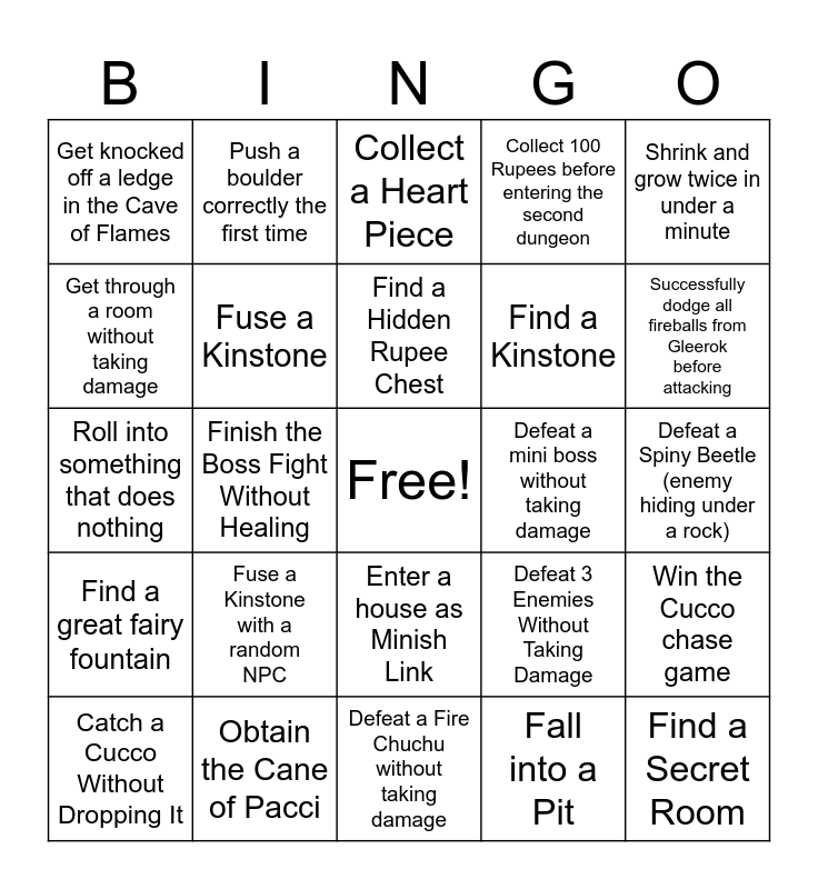 This bingo card has a free space and 24 words: Fuse a Kinstone with a random NPC, Obtain the Cane of Pacci, Find a Hidden Rupee Chest, Catch a Cucco Without Dropping It, Shrink and grow twice in under a minute, Get knocked off a ledge in the Cave of Flames, Get through a room without taking damage, Push a boulder correctly the first time, Defeat a mini boss without taking damage, Enter a house as Minish Link, Find a Kinstone, Roll into something that does nothing, Defeat 3 Enemies Without Taking Damage, Win the Cucco chase game, Fuse a Kinstone, Fall into a Pit, Defeat a Spiny Beetle (enemy hiding under a rock), Collect a Heart Piece, Successfully dodge all fireballs from Gleerok before attacking, Finish the Boss Fight Without Healing, Find a Secret Room, Find a great fairy fountain, Collect 100 Rupees before entering the second dungeon and Defeat a Fire Chuchu without taking damage.