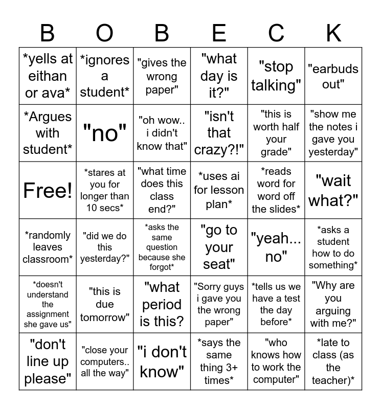 This bingo card has 36 words: "Sorry guys i gave you the wrong paper", "what period is this?, *says the same thing 3+ times*, *Argues with student*, *randomly leaves classroom*, *uses ai for lesson plan*, "no", "i don't know", "stop talking", *tells us we have a test the day before*, "show me the notes i gave you yesterday", "what day is it?", "Why are you arguing with me?", *stares at you for longer than 10 secs*, "isn't that crazy?!", *yells at eithan or ava*, *doesn't understand the assignment she gave us", *reads word for word off the slides*, Free!, "gives the wrong paper", "what time does this class end?", "did we do this yesterday?", "go to your seat", *asks the same question because she forgot*, "yeah... no", *ignores a student*, "this is worth half your grade", "close your computers.. all the way", "oh wow.. i didn't know that", "earbuds out", *late to class (as the teacher)*, "don't line up please", *asks a student how to do something*, "wait what?", "this is due tomorrow" and "who knows how to work the computer".