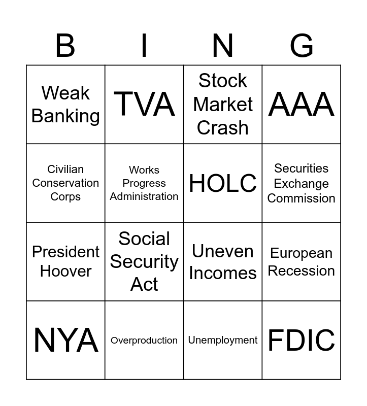 This bingo card has 16 words: Overproduction, European Recession, Stock Market Crash, Weak Banking, President Hoover, TVA, Uneven Incomes, Unemployment, Civilian Conservation Corps, Works Progress Administration, NYA, AAA, Social Security Act, Securities Exchange Commission, HOLC and FDIC.