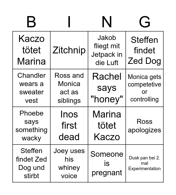 This bingo card has 18 words: Inos first dead, Dusk pan bei 2. mal Experimentation, Jakob fliegt mit Jetpack in die Luft, Kaczo tötet Marina, Marina tötet Kaczo, Steffen findet Zed Dog, Steffen findet Zed Dog und stirbt, Zitchnip, Monica gets competetive or controlling, Phoebe says something wacky, Someone is pregnant, Chandler wears a sweater vest, Ross apologizes, Ross and Monica act as siblings, Rachel says "honey", Rachel clears her throat, Joey uses his whiney voice and Hallway between apartments scene.