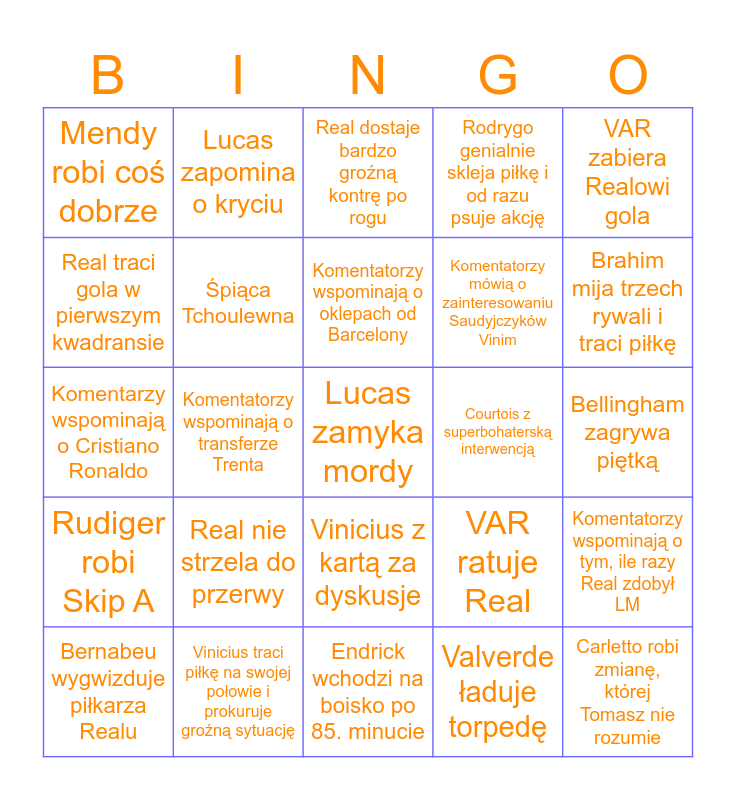 This bingo card has 28 words: Komentatorzy wspominają o tym, ile razy Real zdobył LM, Przynajmniej jeden piłkarz Realu nie gra na swojej naturalnej pozycji, Komentatorzy mówią o zainteresowaniu Saudyjczyków Vinim, Valverde ładuje torpedę, Real traci gola w pierwszym kwadransie, Real dostaje bardzo groźną kontrę po rogu, Lucas zapomina o kryciu, Rudiger robi Skip A, Courtois z superbohaterską interwencją, Bernabeu wygwizduje piłkarza Realu, Komentarzy wspominają o Cristiano Ronaldo, Rodrygo genialnie skleja piłkę i od razu psuje akcję, Vinicius traci piłkę na swojej połowie i prokuruje groźną sytuację, Endrick wchodzi na boisko po 85. minucie, Brahim mija trzech rywali i traci piłkę, Kylian na spalonym, Real nie strzela do przerwy, Śpiąca Tchoulewna, Komentatorzy wspominają o oklepach od Barcelony, Vinicius z kartą za dyskusje, Mendy robi coś dobrze, Carletto robi zmianę, której Tomasz nie rozumie, Lucas zamyka mordy, Komentatorzy wspominają o transferze Trenta, Bellingham zagrywa piętką, VAR ratuje Real, VAR zabiera Realowi gola and Przeciwnicy oklaskują Modricia.