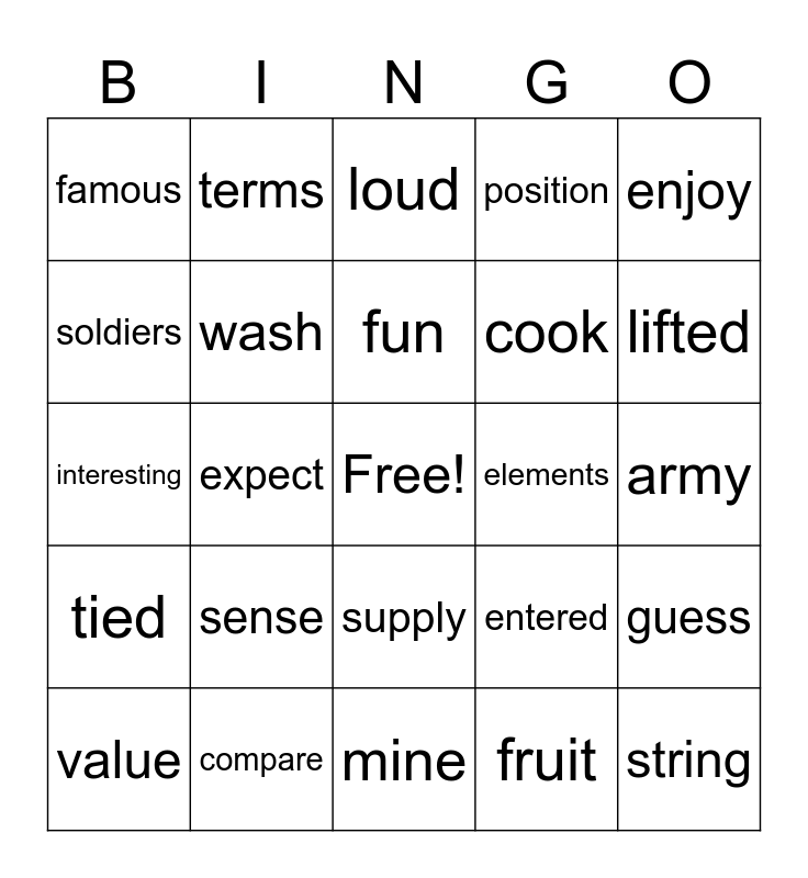 This bingo card has a free space and 100 words: Japanese, addition, army, bell, belong, block, blood, blow, board, bones, branches, cattle, chief, compare, compound, consider, cook, corner, crops, crowd, current, doctor, dollars, eight, electric, elements, enjoy, entered, except, exciting, expect, famous, fit, flat, fruit, fun, guess, hat, hit, indicate, industry, insects, interesting, lie, lifted, loud, major, mall, meat, mine, modern, movement, necessary, observe, park, particular, planets, poem, pole, position, process, property, provide, rather, rhythm, rich, safe, sand, science, sell, send, sense, seven, sharp, shoulder, sight, silent, soldiers, spot, spread, stream, string, suggested, supply, swim, terms, thick, thin, thus, tied, tone, trade, tube, value, wash, wasn't, weight, wife, wings and won't.