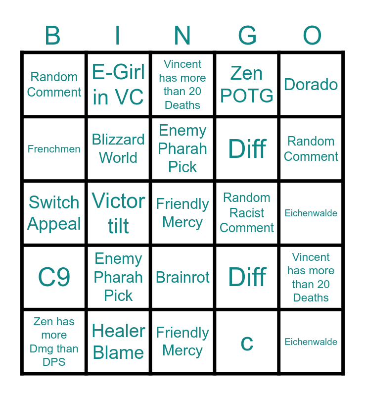 This bingo card has 50 words: Avoid Zen, Healer Blame, Brainrot, Victor Disconnect, Eichenwalde, Frenchmen, E-Girl in VC, Rialto, Diff, Leaver, Random Comment, Blizzard World, Friendly Mercy, c, C9, Zen has more Dmg than DPS, Victor tilt, Enemy Pharah Pick, Queue longer than 5 min, Dorado, Switch Appeal, Unintentional Suicide from map, Vincent has more than 20 Deaths, Random Racist Comment, Zen POTG, C9, Enemy Pharah Pick, Random Racist Comment, Zen POTG, Vincent has more than 20 Deaths, Unintentional Suicide from map, Victor tilt, Dorado, Switch Appeal, Queue longer than 5 min, Zen has more Dmg than DPS, Avoid Phara, Friendly Mercy, Blizzard World, Random Comment, Avoid Zen, Healer Blame, Brainrot, Victor Disconnect, Eichenwalde, Frenchmen, E-Girl in VC, Rialto, Diff and Leaver.