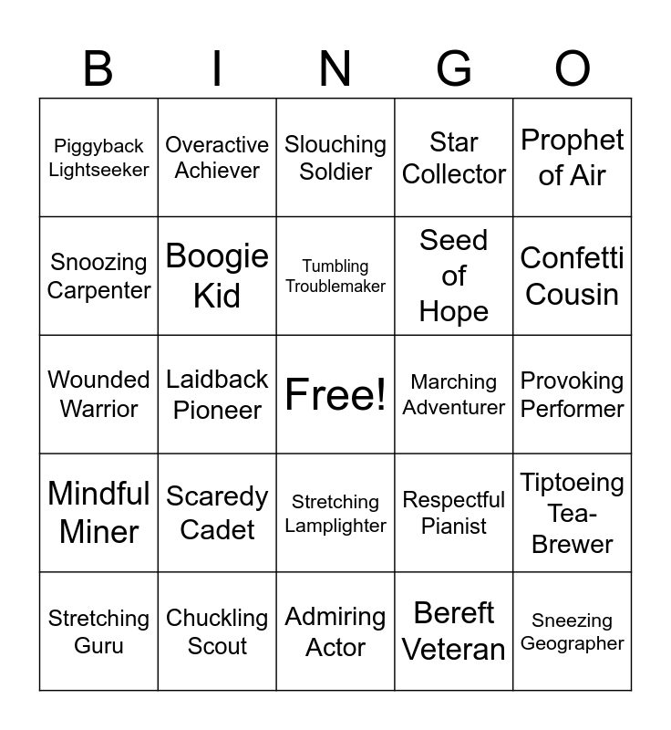 This bingo card has a free space and 29 words: Stretching Guru, Peeking Postman, Laidback Pioneer, Rallying Thrillseeker, Piggyback Lightseeker, Slouching Soldier, Boogie Kid, Scaredy Cadet, Marching Adventurer, Chuckling Scout, Provoking Performer, Sneezing Geographer, Admiring Actor, Bereft Veteran, Confetti Cousin, Melancholy Mope, Stretching Lamplighter, Mindful Miner, Prophet of Air, Wounded Warrior, Respectful Pianist, Running Wayfarer, Seed of Hope, Snoozing Carpenter, Star Collector, Overactive Achiever, Tiptoeing Tea-Brewer, Tumbling Troublemaker and Wounded Warrior.