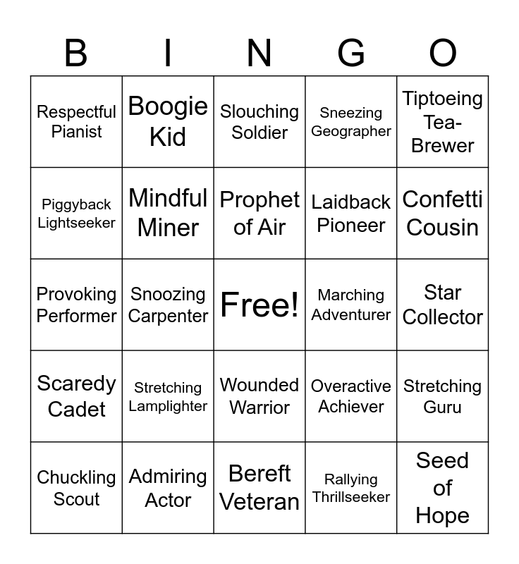 This bingo card has a free space and 28 words: Stretching Guru, Peeking Postman, Laidback Pioneer, Rallying Thrillseeker, Piggyback Lightseeker, Slouching Soldier, Boogie Kid, Scaredy Cadet, Marching Adventurer, Chuckling Scout, Provoking Performer, Sneezing Geographer, Admiring Actor, Bereft Veteran, Confetti Cousin, Melancholy Mope, Stretching Lamplighter, Mindful Miner, Prophet of Air, Wounded Warrior, Respectful Pianist, Running Wayfarer, Seed of Hope, Snoozing Carpenter, Star Collector, Overactive Achiever, Tiptoeing Tea-Brewer and Tumbling Troublemaker.
