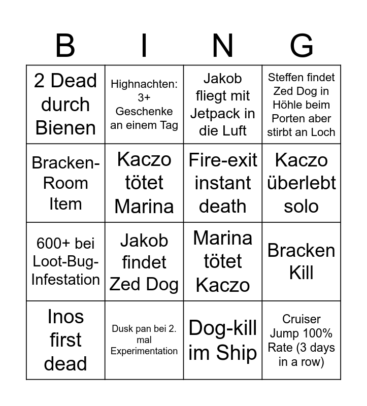 This bingo card has 16 words: Inos first dead, Dusk pan bei 2. mal Experimentation, Jakob fliegt mit Jetpack in die Luft, Steffen findet Zed Dog in Höhle beim Porten aber stirbt an Loch, Bracken-Room Item, Highnachten: 3+ Geschenke an einem Tag, Marina tötet Kaczo, Bracken Kill, 2 Dead durch Bienen, Kaczo tötet Marina, Dog-kill im Ship, Kaczo überlebt solo, 600+ bei Loot-Bug-Infestation, Jakob findet Zed Dog, Fire-exit instant death and Cruiser Jump 100% Rate (3 days in a row).