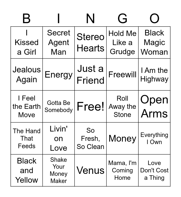 This bingo card has a free space and 56 words: Don't Talk to Strangers, Black and Yellow, Tequila Sunrise, I Kissed a Girl, Venus, Hit 'Em Up Style (Oops), Energy, All I Wanted, Freewill, Airplanes, Hold Me Like a Grudge, Just the Way You Are, If This Isn't Love, The House Is Rockin', All Out of Love, Autumn, Black Magic Woman, Gotta Be Somebody, It Wasn't Me, Love Don't Cost a Thing, Roll Away the Stone, Bananza (Belly Dancer), Money, Stereo Hearts, Space Oddity, Just a Friend, Keep Pushin', Someone New, I Am the Highway, Doo Wop (That Thing), Hunger Strike, Dynamite, Kiss Me Thru the Phone, Apologize, Open Arms, Jealous Again, I Feel the Earth Move, It's Still Rock and Roll to Me, The Hand That Feeds, Secret Agent Man, So Fresh, So Clean, Hurricane, Don’t You (Forget About Me), Amanda, What a Fool Believes, Livin' on Love, Shake Your Money Maker, Get Busy, My Prerogative, Locked Away, Mama, I'm Coming Home, Shakin', We Are Young, Chasing the Sun, Everything I Own and Iris.