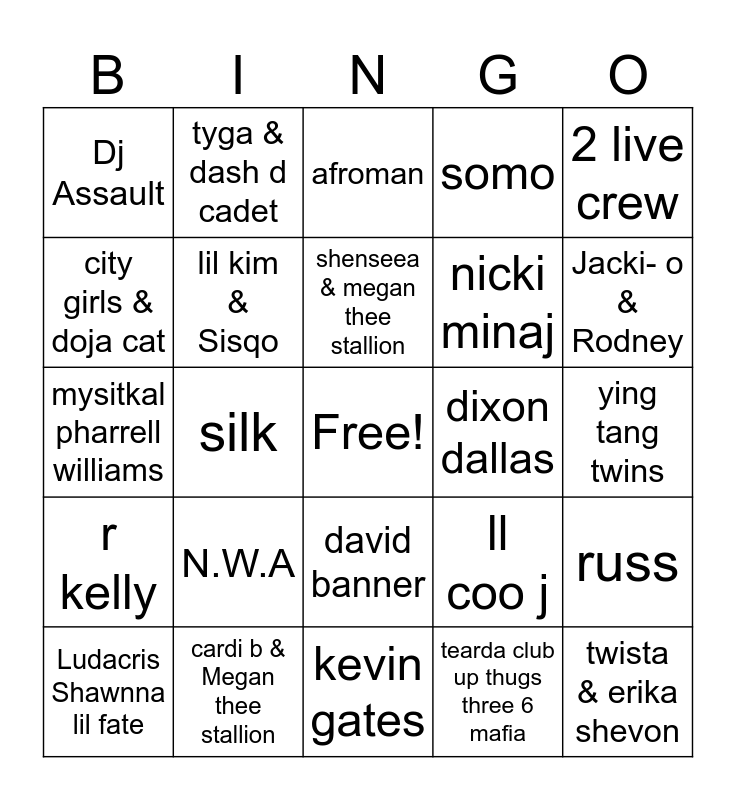 This bingo card has a free space and 34 words: Eazy-E, tearda club up thugs three 6 mafia, khia, splack pack, r kelly, lil kim & Sisqo, 2 live crew, Ludacris Shawnna lil fate, tyga & dash d cadet, wheeler walker jr, shenseea & megan thee stallion, afroman, akinyele kia jeffries, shawnna, dixon dallas, Jacki- o & Rodney, cardi b & Megan thee stallion, mysitkal pharrell williams, N.W.A, ll coo j, david banner, tenacious d, Dj Assault, ying tang twins, kevin gates, twista & erika shevon, somo, sexxy red bruno mars, nicki minaj, city girls & doja cat, Baby tate, silk, russ and nle choppa.
