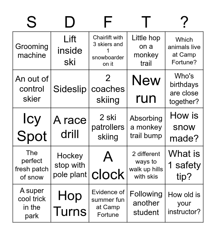This bingo card has 50 words: Retro Snowsuit, Hop Turns, Toboggan, New Drill, How is snow made?, Closed Trail, Lift inside ski, ski patrol base, New run, How do snowguns work?, Grooming machine, Sideslip, 2 ski patrollers skiing, Following another student, How do you become a ski instructor?, The most beautiful snowy tree, A race drill, 2 coaches skiing, Short Radius Turns, Which animals live at Camp Fortune?, Icy Spot, Hopping over a line in the snow, Chairlift with 3 skiers and 1 snowboarder on it, Absorbing a monkey trail bump, What is 1 Skier Responsibility Rule, The perfect fresh patch of snow, Hockey stop with pole plant, Animal tracks in the snow, Little hop on a monkey trail, What is 1 safety tip?, Your tracks on Fresh Corduroy Snow, A thousand steps in turns, A sweet jump, Touch your boots while skiing, What is 1 chairlift safety tip?, A super cool trick in the park, Say thanks to a lift attendant, Evidence of summer fun at Camp Fortune, A new trick, Who's birthdays are close together?, 5 different lifts, Skate skiing on flat terrain, A clock, A tactic you see another class trying, How old is your instructor?, An out of control skier, 3 different ways to stop or slow down, A nest, 2 different ways to walk up hills with skis and Where would you like to go on a ski holiday?.