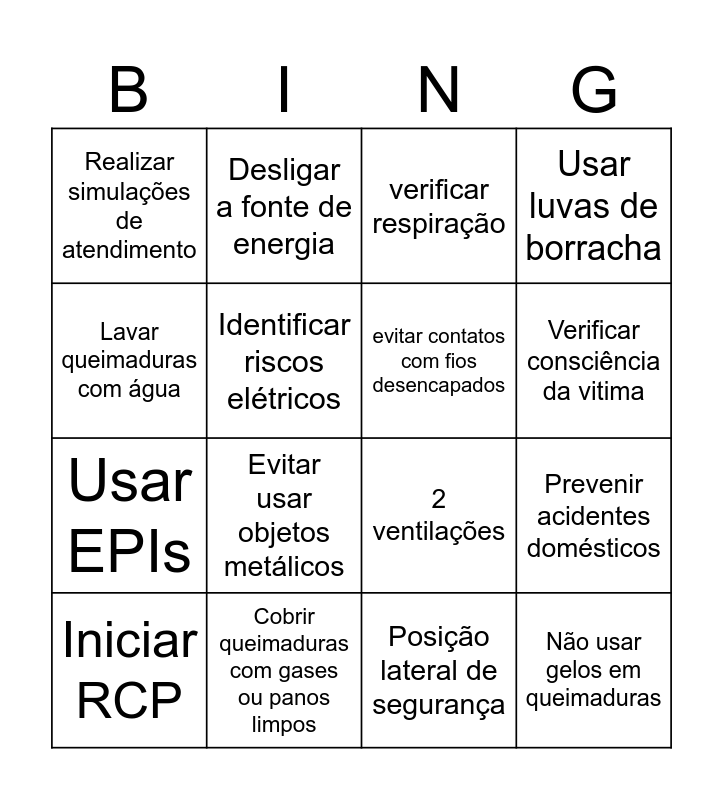 This bingo card has 27 words: Free!, Usar EPIs, Usar EPIs, Acalmar vitima consciente, Identificar riscos elétricos, verificar respiração, Desligar a fonte de energia, Não usar gelos em queimaduras, Cobrir queimaduras com gases ou panos limpos, Verificar pulso da vitima, 2 ventilações, Usar luvas de borracha, Verifique se o local é seguro, 30 Compressões torácica, Evitar usar objetos metálicos, Chamar 192, evitar contatos com fios desencapados, Verificar consciência da vitima, Sinalizar área de risco, Realizar simulações de atendimento, Posição lateral de segurança, Isolar a área do acidente, Prevenir acidentes domésticos, Iniciar RCP, Manter instalações elétricas em bom estado, Lavar queimaduras com água and Usar objeto não condutor.