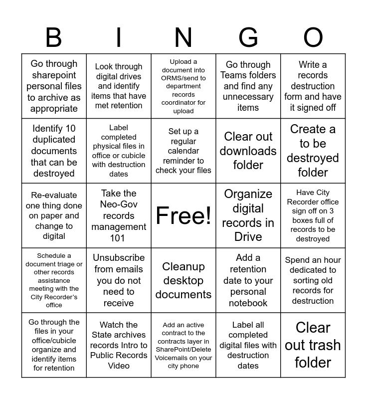 This bingo card has a free space and 24 words: Unsubscribe from emails you do not need to receive, Watch the State archives records Intro to Public Records Video, Set up a regular calendar reminder to check your files, Go through the files in your office/cubicle organize and identify items for retention, Write a records destruction form and have it signed off, Go through sharepoint personal files to archive as appropriate, Identify 10 duplicated documents that can be destroyed, Look through digital drives and identify items that have met retention, Organize digital records in Drive, Cleanup desktop documents, Clear out downloads folder, Re-evaluate one thing done on paper and change to digital, Add a retention date to your personal notebook, Spend an hour dedicated to sorting old records for destruction, Label completed physical files in office or cubicle with destruction dates, Label all completed digital files with destruction dates, Have City Recorder office sign off on 3 boxes full of records to be destroyed, Upload a document into ORMS/send to department records coordinator for upload, Create a to be destroyed folder, Take the Neo-Gov records management 101, Clear out trash folder, Schedule a document triage or other records assistance meeting with the City Recorder’s office, Go through Teams folders and find any unnecessary items and Add an active contract to the contracts layer in SharePoint/Delete Voicemails on your city phone.