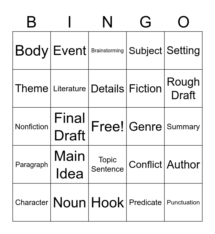 This bingo card has a free space and 25 words: Main Idea, Hook, Details, Character, Setting, Body, Theme, Event, Genre, Topic Sentence, Fiction, Nonfiction, Conflict, Author, Literature, Title, Summary, Brainstorming, Rough Draft, Final Draft, Punctuation, Noun, Paragraph, Subject and Predicate.