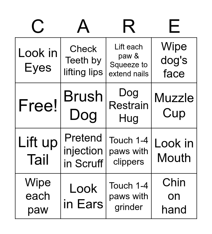 This bingo card has 16 words: Look in Ears, Look in Mouth, Lift each paw & Squeeze to extend nails, Look in Eyes, Lift up Tail, Check Teeth by lifting lips, Touch 1-4 paws with clippers, Touch 1-4 paws with grinder, Free!, Brush Dog, Wipe each paw, Wipe dog's face, Pretend injection in Scruff, Muzzle Cup, Dog Restrain Hug and Chin on hand.