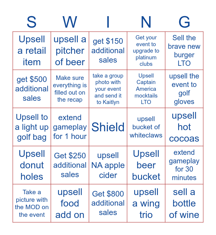 This bingo card has a free space and 24 words: Get $250 additional sales, upsell food add on, take a group photo with your event and send it to Kaitlyn, Take a picture with the MOD on the event, Sell the brave new burger LTO, Upsell a retail item, get $500 additional sales, upsell a pitcher of beer, upsell bucket of whiteclaws, upsell NA apple cider, Upsell Captain America mocktails LTO, Upsell to a light up golf bag, Upsell beer bucket, extend gameplay for 30 minutes, Make sure everything is filled out on the recap, upsell a wing trio, upsell hot cocoas, get $150 additional sales, upsell the event to golf gloves, extend gameplay for 1 hour, sell a bottle of wine, Upsell donut holes, Get your event to upgrade to platinum clubs and Get $800 additional sales.