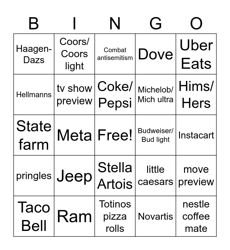 This bingo card has a free space and 24 words: Jeep, Ram, Coke/ Pepsi, Taco Bell, Uber Eats, Haagen-Dazs, Hellmanns, Coors/ Coors light, Budweiser/ Bud light, Stella Artois, Michelob/ Mich ultra, State farm, little caesars, move preview, tv show preview, Novartis, Instacart, Combat antisemitism, Hims/ Hers, Meta, nestle coffee mate, pringles, Dove and Totinos pizza rolls.