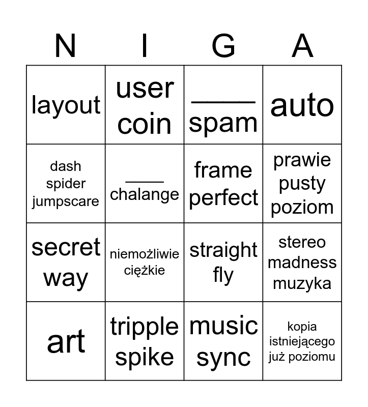This bingo card has 16 words: tripple spike, stereo madness muzyka, ____ spam, layout, secret way, user coin, straight fly, music sync, dash spider jumpscare, ____ chalange, art, auto, niemożliwie ciężkie, prawie pusty poziom, frame perfect and kopia istniejącego już poziomu.