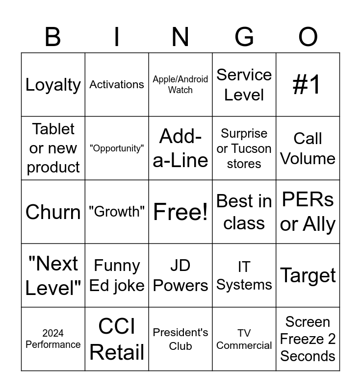 This bingo card has a free space and 33 words: AT&T, "Actionable", "Growth", "Hats off", "Next Level", "Opportunity", #1, 2024 Performance, Activations, Adapt, Add-a-Line, Apple/Android Watch, Awkward Question from audience, Barbie Phone, Best in class, Call Volume, CCI Retail, Churn, Funny Ed joke, IT Systems, JD Powers, Looking Ahead, Loyalty, PERs or Ally, President's Club, Screen Freeze 2 Seconds, Service Level, Surprise or Tucson stores, Tablet or new product, Target, Ted Danson, TV Commercial and Warehouse.