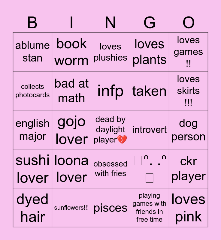 This bingo card has 25 words: loona lover, pisces, infp, dyed hair, loves games !!, ablume stan, collects photocards, book worm, introvert, obsessed with fries, taken, english major, ꒰ᐢ. .ᐢ꒱, ckr player, bad at math, loves pink, dog person, loves plushies, loves skirts !!!, gojo lover, dead by daylight player💔, sunflowers!!!, sushi lover, loves plants and playing games with friends in free time.