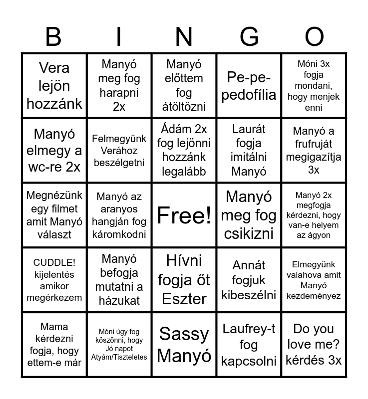 This bingo card has a free space and 24 words: Manyó befogja mutatni a házukat, Móni úgy fog köszönni, hogy Jó napot Atyám/Tiszteletes, Ádám 2x fog lejönni hozzánk legalább, Mama kérdezni fogja, hogy ettem-e már, Móni 3x fogja mondani, hogy menjek enni, Vera lejön hozzánk, Manyó elmegy a wc-re 2x, Manyó meg fog harapni 2x, Manyó meg fog csikizni, Hívni fogja őt Eszter, Laurát fogja imitálni Manyó, Megnézünk egy filmet amit Manyó választ, Annát fogjuk kibeszélni, Elmegyünk valahova amit Manyó kezdeményez, Felmegyünk Verához beszélgetni, Laufrey-t fog kapcsolni, Manyó 2x megfogja kérdezni, hogy van-e helyem az ágyon, Manyó előttem fog átöltözni, Manyó a frufruját megigazítja 3x, Manyó az aranyos hangján fog káromkodni, Do you love me? kérdés 3x, CUDDLE! kijelentés amikor megérkezem, Pe-pe-pedofília and Sassy Manyó.