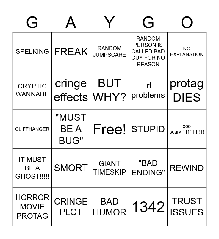 This bingo card has a free space and 24 words: SMORT, CRINGE PLOT, BUT WHY?, HORROR MOVIE PROTAG, NO EXPLANATION, SPELKING, CRYPTIC WANNABE, FREAK, STUPID, GIANT TIMESKIP, irl problems, CLIFFHANGER, "BAD ENDING", REWIND, cringe effects, 1342, ooo scary!11111!!!!1!, RANDOM JUMPSCARE, protag DIES, "MUST BE A BUG", TRUST ISSUES, IT MUST BE A GHOST!!!!!, RANDOM PERSON IS CALLED BAD GUY FOR NO REASON and BAD HUMOR.