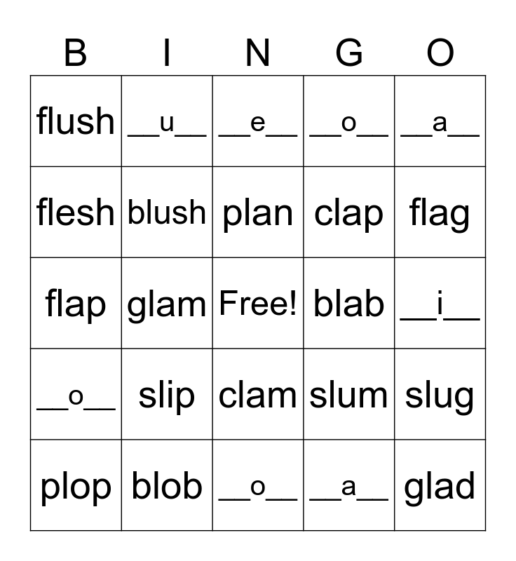 This bingo card has a free space and 24 words: slip, blob, plan, plop, __a__, flush, flesh, __u__, blab, clam, clap, flap, slum, slug, blush, __a__, __i__, __e__, flag, glam, glad, __o__, __o__ and __o__.