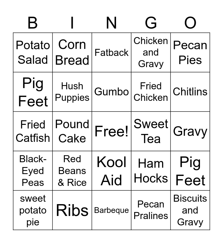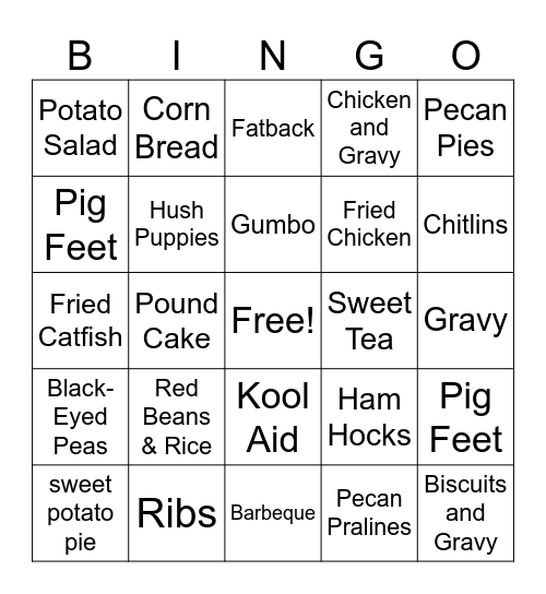 This bingo card has a free space and 32 words: Pecan Pralines, Frazier, Pound Cake, Wings, Black-Eyed Peas, Hush Puppies, Pecan Pies, Pig Feet, Corn Bread, collard greens, Gumbo, Fatback, Mac N Cheese, biscuit, Sweet Tea, Okra, sweet potato pie, Fried Catfish, Kool Aid, Red Beans & Rice, Ham Hocks, Soul Food, Gravy, Ribs, Biscuits and Gravy, Chicken and Gravy, Fried Chicken, Pig Feet, Potato Salad, Barbeque, Banana Pudding and Chitlins.