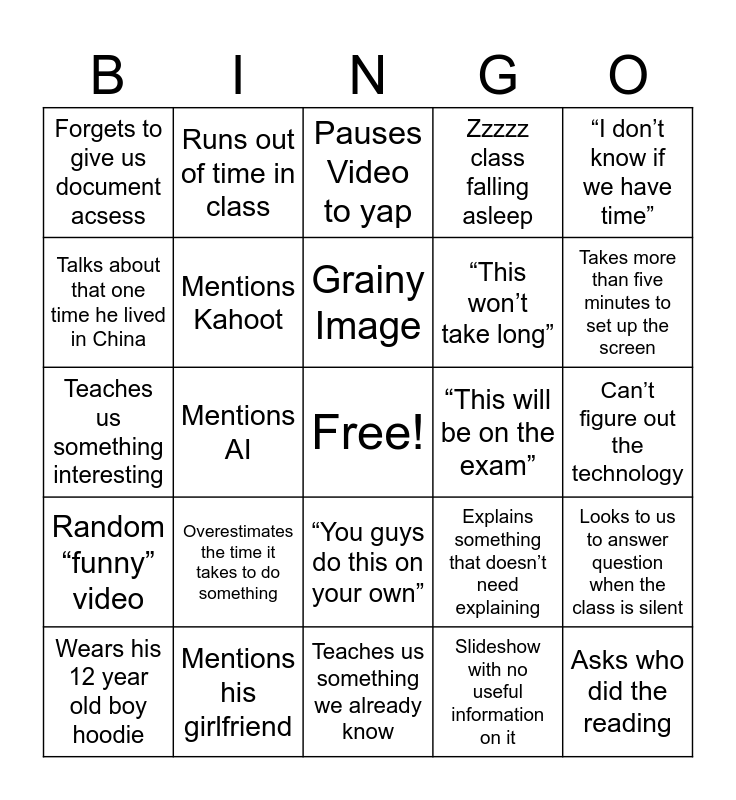 This bingo card has a free space and 38 words: Teaches us something that’s common sense, Unfunny Meme on slides, Monty Python reference, Mentions Kahoot, Looks to us to answer question when the class is silent, Overestimates the time it takes to do something, Grainy Image, Gen z slang, “I don’t know if we have time”, “This won’t take long”, Mentions AI, Zzzzz class falling asleep, Asks who did the reading, Can’t figure out the technology, Talks about that one time he lived in China, Random “funny” video, *crickets*, Pauses Video to yap, Overcomplicates something simple, “This will be on the exam”, Forgets to give us document acsess, Mentions his girlfriend, Takes more than five minutes to set up the screen, Wears his 12 year old boy hoodie, Out of pocket comments, Teaches us something we already know, Asks if anyone has travelled to xyz so he can brag about his trips, “I’ve actually been there”, Practice Question no one does, Starts speaking another language, Advertises study that no one uses, “You guys do this on your own”, Slideshow with no useful information on it, Runs out of time in class, Goes on a tangent, Explains something that doesn’t need explaining, Teaches us something interesting and Says we have a progress check - We do not have one.