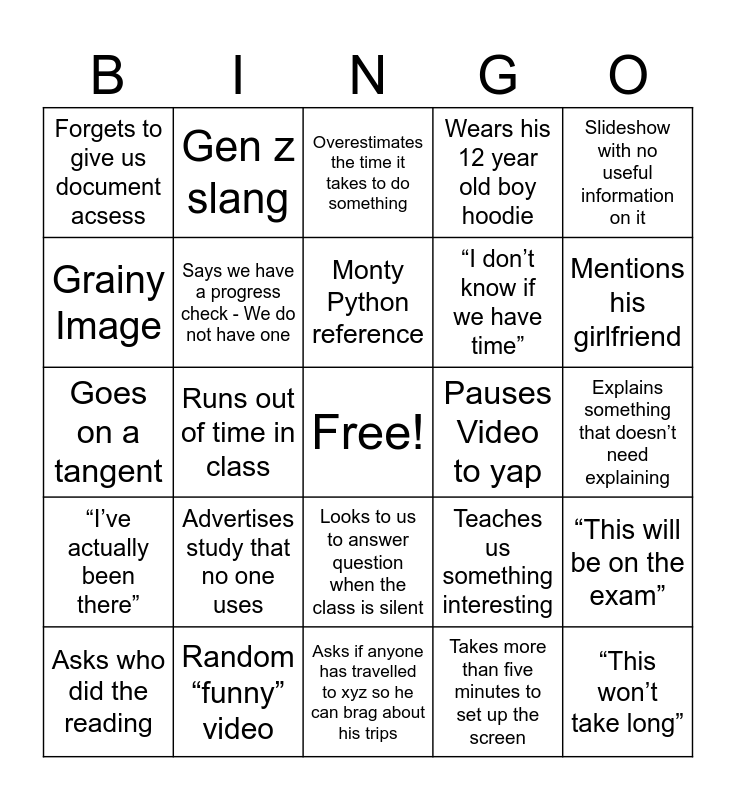 This bingo card has a free space and 38 words: Overcomplicates something simple, Unfunny Meme on slides, Teaches us something we already know, Says we have a progress check - We do not have one, “This will be on the exam”, Advertises study that no one uses, Monty Python reference, Out of pocket comments, Slideshow with no useful information on it, “I don’t know if we have time”, Runs out of time in class, Wears his 12 year old boy hoodie, “This won’t take long”, Explains something that doesn’t need explaining, Grainy Image, “I’ve actually been there”, Mentions Kahoot, Overestimates the time it takes to do something, *crickets*, Pauses Video to yap, Forgets to give us document acsess, Random “funny” video, Mentions his girlfriend, Asks who did the reading, “You guys do this on your own”, Asks if anyone has travelled to xyz so he can brag about his trips, Talks about that one time he lived in China, Zzzzz class falling asleep, Can’t figure out the technology, Mentions AI, Teaches us something that’s common sense, Looks to us to answer question when the class is silent, Takes more than five minutes to set up the screen, Gen z slang, Starts speaking another language, Teaches us something interesting, Goes on a tangent and Practice Question no one does.