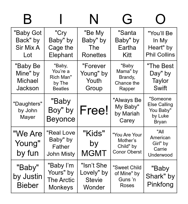 This bingo card has a free space and 29 words: "Baby" by Justin Bieber, "…Baby One More Time" by Britney Spears, "Baby Boy" by Beyonce, "Ice Ice Baby" by Vanilla Ice, "Baby Got Back" by Sir Mix A Lot, "Be My Baby" by The Ronettes, "Baby, You’re a Rich Man" by The Beatles, "Real Love Baby" by Father John Misty, "Always Be My Baby" by Mariah Carey, "Baby I’m Yours" by The Arctic Monkeys, "Someone Else Calling You Baby" by Luke Bryan, "Baby Shark" by Pinkfong, "Isn’t She Lovely" by Stevie Wonder, "Sweet Child of Mine" by Guns ’n Roses, "The Best Day" by Taylor Swift, "When You Were Young" by The Killers, "Kids" by MGMT, "We Are Young" by fun, "You’ll Be In My Heart" by Phil Collins, "Daughters" by John Mayer, "You Are Your Mother’s Child" by Conor Oberst, "My Girl" by The Temptations, "Baby Mama" by Brandy, Chance the Rapper, "Baby Be Mine" by Michael Jackson, "Santa Baby" by Eartha Kitt, "Cry Baby" by Cage the Elephant, "All American Girl" by Carrie Underwood, "Forever Young" by Youth Group and "Best Thing" by Ray LaMontagne.
