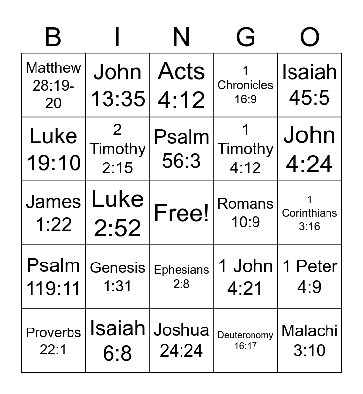 This bingo card has a free space and 25 words: Genesis 1:31, Joshua 24:24, Psalm 56:3, Proverbs 22:1, Isaiah 45:5, Matthew 28:19-20, Luke 19:10, John 13:35, Romans 10:9, Ephesians 2:8, 1 Timothy 4:12, James 1:22, 1 John 4:21, 1 Peter 4:9, 2 Timothy 2:15, 1 Thessalonians 5:18, 1 Corinthians 3:16, Acts 4:12, John 4:24, Luke 2:52, Malachi 3:10, Isaiah 6:8, Psalm 119:11, 1 Chronicles 16:9 and Deuteronomy 16:17.