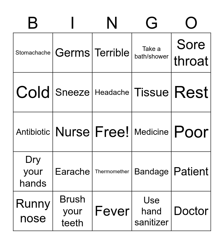 This bingo card has a free space and 25 words: Earache, Fever, Headache, Runny nose, Sore throat, Stomachache, Cold, Germs, Medicine, Thermomether, Tissue, Antibiotic, Bandage, Patient, Sneeze, Smell, Poor, Terrible, Rest, Nurse, Doctor, Brush your teeth, Dry your hands, Take a bath/shower and Use hand sanitizer.