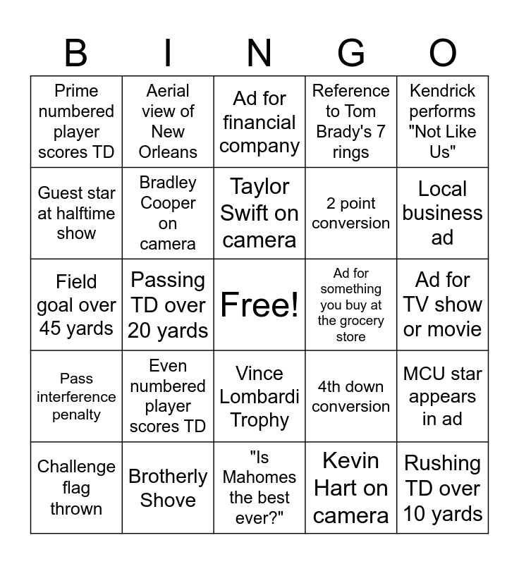 This bingo card has a free space and 24 words: Even numbered player scores TD, Brotherly Shove, Taylor Swift on camera, Challenge flag thrown, Kendrick performs "Not Like Us", Prime numbered player scores TD, Guest star at halftime show, Aerial view of New Orleans, Ad for something you buy at the grocery store, Vince Lombardi Trophy, 2 point conversion, Field goal over 45 yards, 4th down conversion, MCU star appears in ad, Bradley Cooper on camera, Kevin Hart on camera, Ad for TV show or movie, Ad for financial company, Local business ad, Passing TD over 20 yards, Rushing TD over 10 yards, Pass interference penalty, Reference to Tom Brady's 7 rings and "Is Mahomes the best ever?".