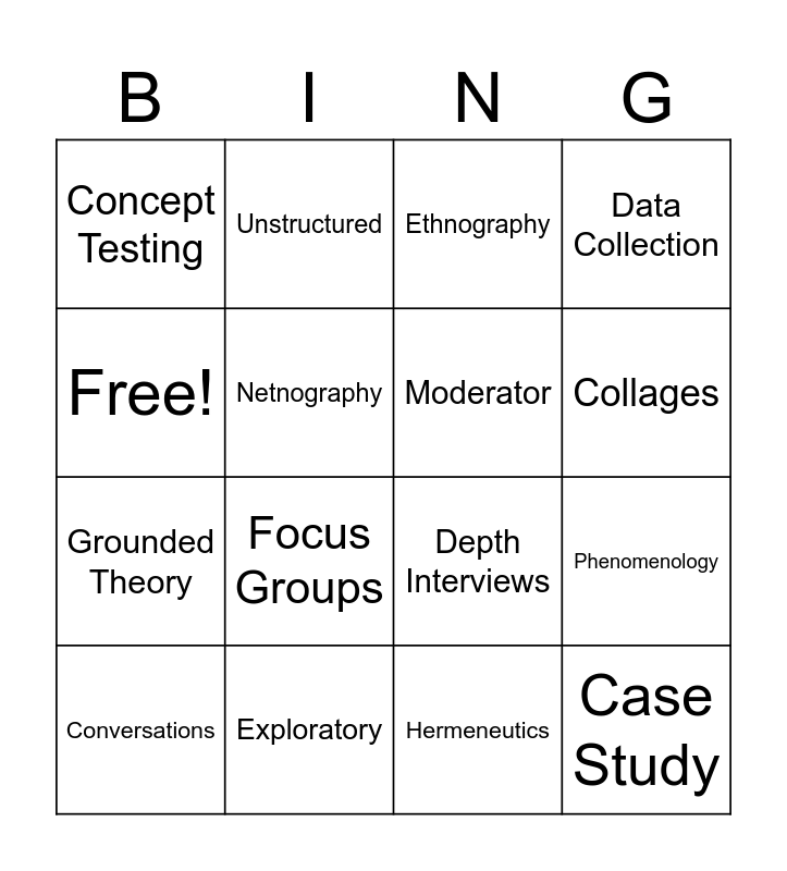 This bingo card has 16 words: Exploratory, Phenomenology, Ethnography, Concept Testing, Grounded Theory, Unstructured, Depth Interviews, Hermeneutics, Free!, Netnography, Conversations, Data Collection, Focus Groups, Collages, Moderator and Case Study.